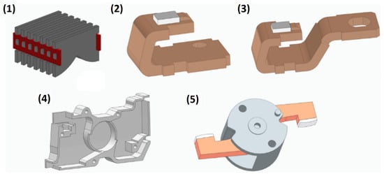The main elements of the current path of the tested molded case circuit breaker drawn in 3D: (1)—arc chamber, (2)—fixed contact, (3)—second fixed contact, (4)—connection chamber housing, (5)—movable contact.