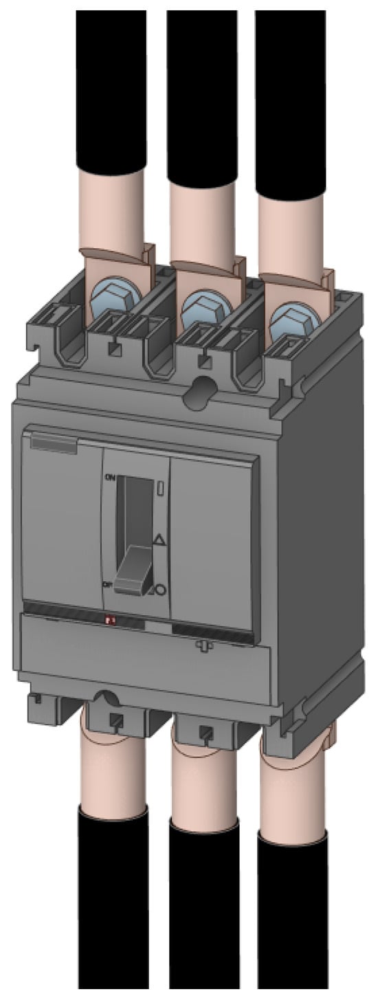 A 3D assembly of the entire molded case circuit breaker was prepared. After developing a 3D model of the compact circuit breaker, it was possible to model the power cables of the analyzed device, as shown in Figure 10 below. The 3D model of the compact circuit breaker prepared in this way was ready to be imported into the appropriate calculation modules in ANSYS Workbench, which allow for performing coupled analyses, which, after complex calculation iterations, allow for checking how the selected physical phenomena interact with each other.