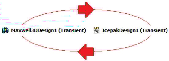 Using the software capabilities for the work, a coupled analysis was performed between two solvers: Maxwel 3D ⇔ Icepak. A simplified diagram of the calculations for the compact circuit breaker under consideration is shown below in Figure 11.
