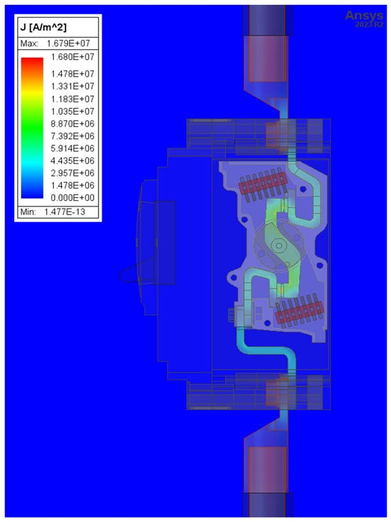 The coupled analysis modeled using ANSYS based on two basic environments, Maxwell 3D and Icepak, obtained a visualization showing precise results related to the current flowing (250 A) through the tested compact circuit breaker. The current density distribution in the circuit breaker current paths was the highest at the contact point of the contact plates, as shown in Figure 12 below.