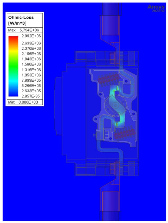 The current flowing through the circuit breaker current paths induced power losses in the form of heat emitted by active structural components. The intensity of these losses can be observed in Figure 13 below.