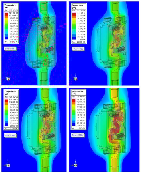 The temperature distribution for selected times is presented at the subsequent stages of simulation for the individual elements of the current path of the molded case circuit breaker for the rated current of 250 A.