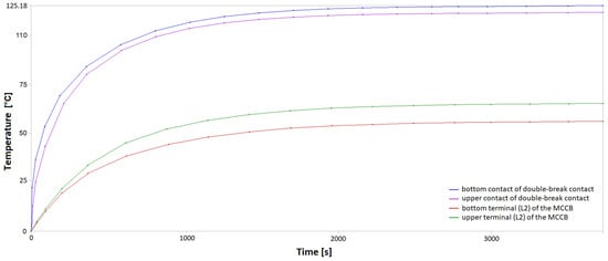 The analysis covered the process of heat generation growth in the active elements of the analyzed current path of the compact circuit breaker under the influence of the flow of rated current of In = 250 A; the parameters were regulated using an autotransformer. A graph (Figure 20) of the heating process of the conductive elements was drawn from the observed temperature changes, where the highest temperature value was recorded in the area of the lower contact of the circuit breaker, slightly over 122.9 °C; the temperature increase for the area of the lower contact was 117 °C. On the surface of the lower connection terminal, the temperature reached 69.7 °C, and on the surface of the upper terminal, it reached 52.5 °C. A comparison of the simulation analysis results showed high convergence with experimental test results. The obtained temperature values for individual elements of the analyzed current path showed an error of no more than 5%, which is a satisfactory result for the conducted analyses.