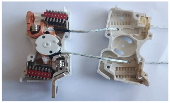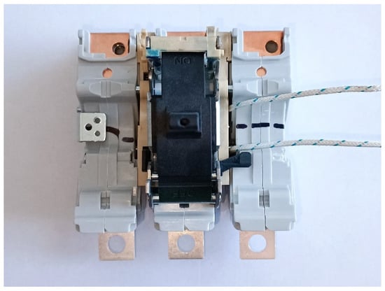 To validate the results obtained from numerical simulations regarding the flow of rated current through the tested mechanism, experimental studies were conducted. These studies aimed to assess the temperature rise in individual elements of the current path of a compact circuit breaker with a rated current of 250 A. For this purpose, type K thermocouples were used and mounted in a way that allowed temperature measurement without interfering with the proper functioning of the breaker’s disconnection mechanism (Figure 16).
