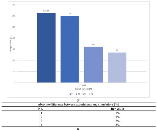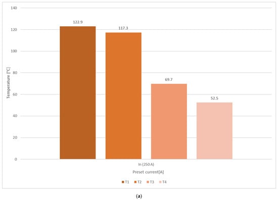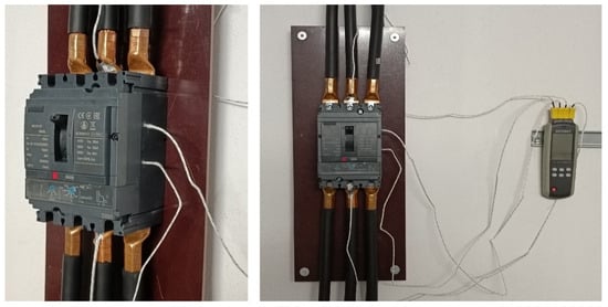In accordance with the requirements of the PN-EN 60947-2 standard [23], the temperature measurements were conducted without removing or unscrewing the breaker’s housing cover, which is crucial to maintaining the integrity of the tested devices. The experimental tests aimed to confirm the accuracy of the numerical simulations and verify whether the results obtained during the simulations corresponded to the actual operating conditions of the circuit breaker under rated current load.