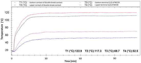 Based on the coupled analysis, heating curves for the active elements were generated and later compared with experimental results. For testing, a specially adapted breaker was used with type K thermocouples placed inside, without affecting the device’s mechanical or electrical performance. These sensors enabled precise temperature monitoring of the contacts and terminals. Data were recorded with a high-accuracy temperature logger, allowing for the creation of detailed heating curves.