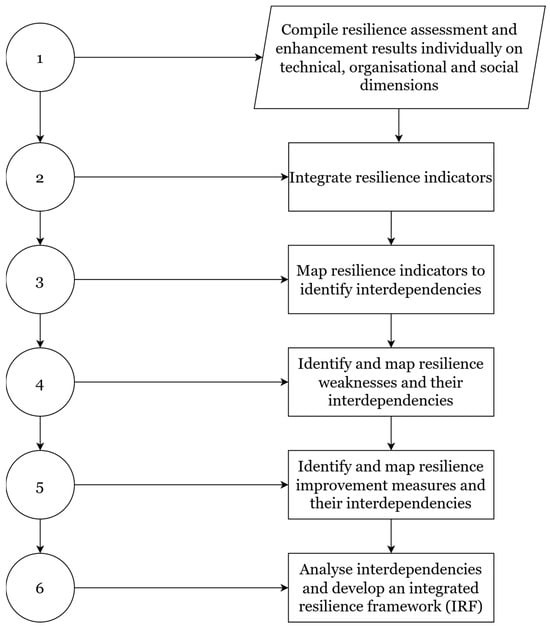 Figure 1 outlines a methodology for integrated resilience analysis which leads to the development of an IRF. The process involves compiling assessment results from case studies described in Section 2.1, integrating their respective indicators, mapping interdependencies, identifying connected vulnerabilities and improvement measures, and analysing them to enhance overall resilience.