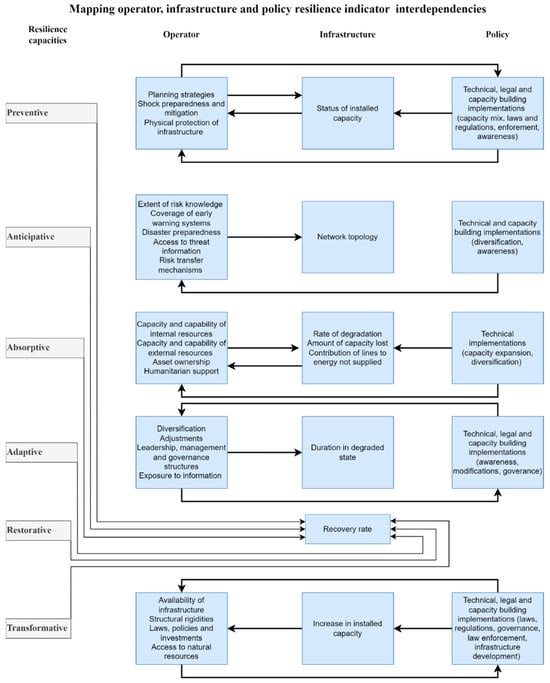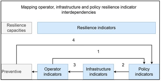 The integrated indicators were then mapped to identify interdependencies. The direction of the arrows indicates how the arrow’s source affects the arrow’s destination, thus showing the relationships between different indicators and highlighting how indicators from one dimension influence or depend on indicators from another. For example, in Figure 2, arrow 1 from operator to policy indicators shows how the existence of shock preparedness may be a manifestation of policy implementation. On the other hand, policy implementation may shape the electricity supply structure (arrow 2), thereby providing shock mitigation, e.g., through diversification (arrow 3), which may enhance the preventive capacity. Having an adequate level of preventive capacity may decrease the target for some policy indicators (arrow 4). Identifying these interdependencies was crucial for understanding the complex relationships underpinning resilience.