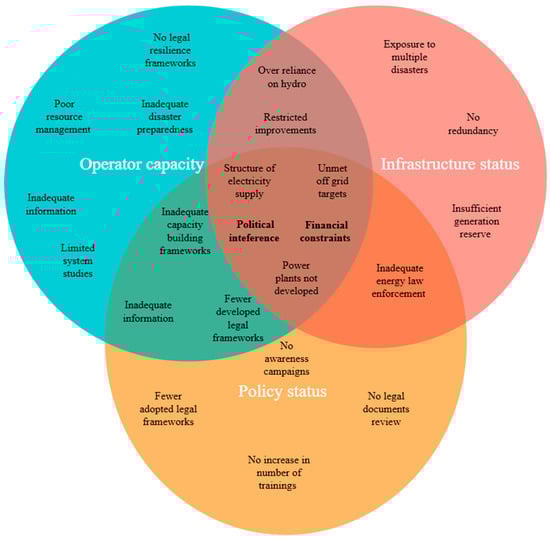 Organisational and policy domains intersect in capacity building, legal frameworks, and information sharing. The absence of resilience-oriented capacity-building frameworks by policymakers was evident in the operator’s inadequate resilience-oriented training since training promotes institutional resilience [,]. The lack of specific legal frameworks or clauses allows Operators to discharge their duties carelessly, exacerbating physical infrastructure inadequacies and inherent weaknesses []. These infrastructure weaknesses are bidirectional. On one hand, the operator neglects proper maintenance, repairs, and development of the installed capacity. On the other hand, the infrastructure is old, inherently weak, has insufficient installed capacity, compromised network topology, and is exposed to multiple disasters.