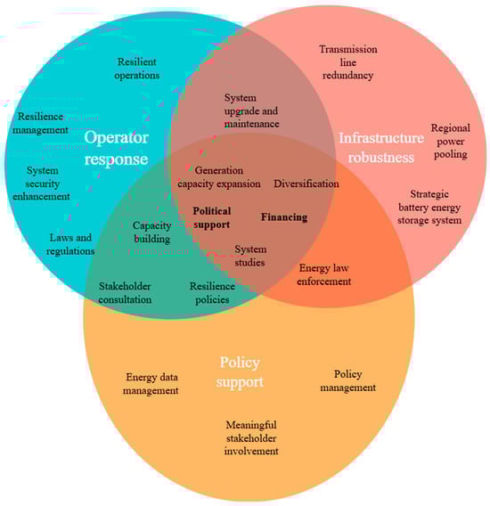 Resilience improvement in the context of energy systems is a multifaceted endeavour that necessitates the interconnection of various measures across different dimensions [,]. For an infrastructure solely under the operator’s custody, the capacity of that operator to manage the infrastructure during grid emergencies depends on the infrastructure’s robustness []. This was also established in the case studies [], underscoring the need for holistic resilience enhancement, which is demonstrated in Figure 5. Similarly, infrastructure robustness depends on policy support through effective policy implementation and improved operator response. Based on the infrastructure resilience challenges that were identified in the case studies, infrastructure robustness depends on transmission and generation capacity expansion, which heavily relies on effective policy implementation. In the case studies, transmission line redundancy [], adequate generation reserve, and strategic placement of battery energy storage (BES) were explored for grid improvement. Generally, standard enhancement measures include diversification focusing on distributed energy resources (DERs), which reduces dependency on single sources and increases adaptability during disruptions. Distributed generation enhances generation reserve as well as emergency response [,,]. Microgrids (MGs) take part in emergency response by supplying critical loads. System upgrades and maintenance are crucial for ensuring the infrastructure remains robust and capable of withstanding or quickly recovering from adverse events. System studies can inform these system upgrades. System studies can also inform policy formulations thereby ensuring clear, achievable and empirical-based targets. Capacity expansion and system studies help understand the evolving demands and potential vulnerabilities, allowing for proactive improvements.