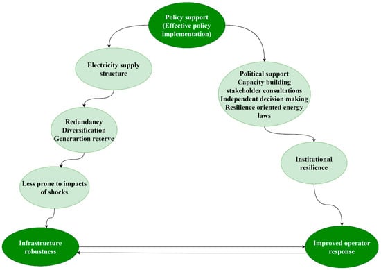 While an integrated, comprehensive approach to PSR is essential, energy policy support is superior to grid operator response and infrastructure resilience, as shown in Figure 6. Effective NEP support is pivotal in making the infrastructure robust through effective policy implementation []. It shapes the electricity supply structure by promoting diversification, redundancy, and generation reserves and ensuring physical protection through strong legal frameworks and resilience policies. These policies are instrumental in establishing a solid foundation for infrastructure, making it less prone to disruptions and more capable of withstanding various challenges. The grid operator, in turn, relies on this strengthened infrastructure to maintain continuous electricity delivery during grid disturbances []. Robust infrastructures experience fewer failures during extreme events and are at lower risk of cascading failures. These features prevent grid operator overload and panic-driven decisions. The inclusion of backup systems is one of the characteristics of enhanced infrastructure, which enables grid operators to reroute power or isolate quickly during grid disturbances, thereby enabling faster and more effective recovery. Further, robust grids have advanced situational monitoring tools, which allow proactive adjustments and help operators act preventively rather than reactively. Furthermore, resilient infrastructures often align with standardised emergency procedures, for example, the North American Electric Reliability Corporation (NERC). This facilitates preparedness and enhances quick response. While the operator depends on infrastructure robustness, improved operator response capacity enhances the infrastructure. An enhanced operator can advocate for upgrades, is less stressed and is free to concentrate on further improvements. However, an improved operator response alone does not replace weak infrastructure, and institutional support is needed to implement the proposed upgrades. Moreover, the operator’s ability to respond smoothly depends on institutional resilience, bolstered by supportive energy policies. As a state-owned entity, the operator’s independence in decision-making is significantly influenced by political support, well-structured energy laws, meaningful stakeholder consultations, and comprehensive capacity-building initiatives. Therefore, while operator response and infrastructure resilience are critical, the overarching influence of energy policy support ensures that these elements function effectively within a robust and resilient power system framework. Thus, an effective energy policy could be crafted in a manner which accounts for infrastructure robustness and operational needs to avoid grid failures. For example, an energy policy pushing for more grid-connected solar PVs could stress the grid if the network lacks load-balancing capacity and operators do not have the capacity to manage severe grid disturbances. Addressing this might involve a phased PV rollout, diversifying electricity generation, phased generation expansion, financial resource allocations to the energy sector to facilitate policy implementation and capacity building.