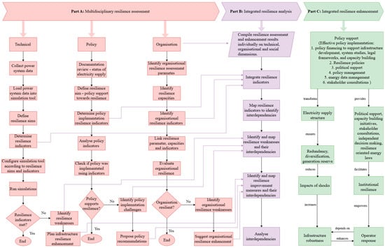 With the multidisciplinary complexity of resilience challenges, holistic evaluation and enhancement have been the main concerns in resilience research. This paper addresses this gap by demonstrating the integrated analysis of operator response capacity, energy policy support and infrastructure robustness using Malawi’s cases. The three individual case studies were pooled, focusing on integrating their resilience indicators, identifying the resilience weaknesses and mapping their interdependencies to inform holistic integrated, holistic enhancement measures. A nuanced understanding of resilience was achieved by integrating indicators based on their respective capacities (preventive and anticipative, absorptive, adaptive, restorative and transformative) across the three resilience dimensions (operator, policy and infrastructure). Mapping relationships between indicators revealed crucial interdependencies and was essential for understanding the complex relationships that underpin resilience. This resulted in development of an integrated resilience framework (IRF) which provides guidelines for comprehensive and inclusive resilience evaluations, especially for weak and underdeveloped grids. The structure of the electricity supply and institutional challenges are at the centre of Malawi’s resilience challenges, aggravated by the non-implementation of the energy policy, which results from, among other reasons, political interference and financial constraints. The paper provides integrated solutions to the identified resilience challenges.