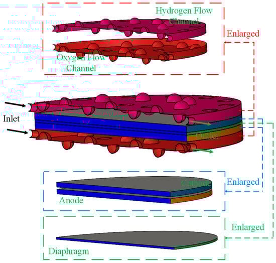 Industrial electrolytic cells generally possess a compact, stacked structure. Each cell comprises the bipolar plates, the cathode, the anode, and the membrane. Given the substantial scale of industrial electrolyzes, this study focuses on simulating a laboratory-scale single cell to reduce computational complexity. Therefore, a scaled-down model of the single-chamber electrolyze is developed with a reduced electrode chamber diameter of 100 mm while preserving key model features [22]. The reduced size of the electrolyze still ensures the capture of typical fluid characteristics and flow patterns in the bipolar plate channels [17]. Since the anode and cathode chambers have identical structures, the computation domain is simplified by selecting a single electrode chamber. The concave–convex structures with different shapes within the electrode plates are arranged uniformly. The primary geometric parameters are introduced using the nipple structure as an example: the cylindrical electrode chamber is established with a diameter of 100 mm, and the nipple structure consists of spheres with a diameter of 6 mm (the side length of both the square and triangular structures is 6 mm).