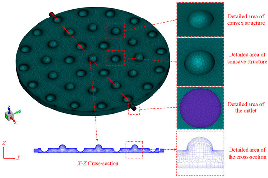 This study generates a polyhedral unstructured mesh for the computational model using Fluent Meshing software of Version 2016. Unstructured meshes are flexible and well-suited for complex geometries like ours. In particular, an unstructured mesh generation can ensure computational efficiency while maintaining the accuracy of the results [23]. To capture the characteristics of near-wall flow, particularly the turbulent viscous effects in the boundary layer region, mesh refinement is applied at the concave–convex structures near the channel walls and the sphere. The initial mesh layer’s thickness near the wall is set to 0.1 mm, with a mesh growth factor of 1.2, comprising six layers. Taking the nipple structure as an example, the final mesh configuration is shown in Figure 4.