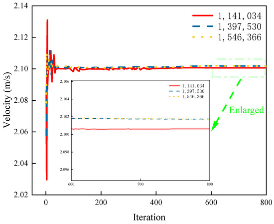 A grid independence test ensures that the simulation results are reliable and independent of grid resolution. For the nipple structure, three different maximum mesh sizes are used, i.e., 0.6, 1, and 1.2, resulting in total mesh elements of 1,141,034, 1,397,530, and 1,546,366, respectively. The results show negligible disparity for the velocity at the outlet when the mesh element counts are 1,397,530 and 1,546,366, meaning that the computational accuracy stabilizes upon reaching 1,397,530 mesh elements. The mesh independence validation is depicted in Figure 5. For the other five cases, the same independence tests are also conducted. The final adoptive mesh elements are given in Table 2.