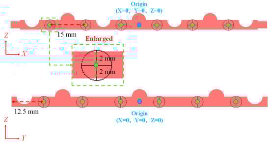An analysis of the velocity and streamline distribution and vorticity distribution within the scaled-down-sized electrolyze flow channel is performed to investigate the influence of concave–convex structure types on the flow field distribution under multi-inlet conditions. The observation planes are the Y-Z plane at X = 0 mm, X-Y plane at Z = 0 mm, and X-Z plane at Y = 0 mm. The specific cross-section and the origin are shown in Figure 6.