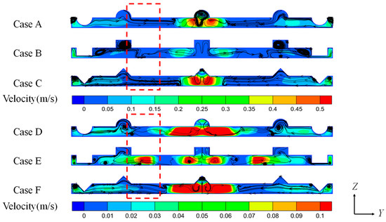 Figure 7 and Figure 8 illustrate the velocity and streamline distribution characteristics in the Y-Z plane where X = 0 mm and the X-Y plane where Z = 0 mm under different structural configurations. As shown in Figure 7, in Cases A to F, the flow within the channel is predominantly longitudinal (in the X-direction). It is found that the presence of concave–convex structures significantly alters the distribution characteristics of the fluid in the transverse (Y-direction), as shown in Figure 8. Specifically, by obstructing the fluid flow, the concave–convex structures enhance the transverse liquid distribution effect, leading to significant changes in both flow velocity and distribution in the transverse direction. This modification contributes to improving the yield of gas products within the electrolyze. However, it may also influence overall energy consumption due to the increased flow resistance. In all configurations, the flow velocity in the central region of the channel is generally higher, indicating that the fluid retains significant kinetic energy in the main flow area. In contrast, the flow velocity is lower in the peripheral regions, which results in a higher degree of flow field non-uniformity, leading to uneven local distributions of reactant concentration and temperature. Moreover, in the single inlet/outlet setups, the velocity near the center axis along the mainstream direction is higher than at the edge of the channels. The low velocity and circulation region accounts for a large proportion of the anode/cathode area as shown in Figure 8. Generally, the circulation has a negative effect on the removal of gas bubbles. Also, a low velocity reduces the heat and ion transfer, decreasing the electrolyze efficiency. For the multiple inlet/outlet model, however, the electrolyte flows across more areas along the channel. Those setups enhance the high velocity regions and mitigate the electrolyte circulation.
