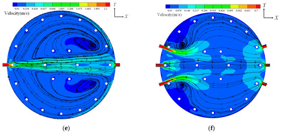 Streamline distribution in the electrolyze in X-Y plane (Z = 0); (a) Case A; (b) Case D; (c) Case B; (d) Case E; (e) Case C; (f) Case F.