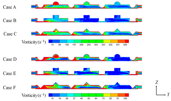Figure 9 illustrates the vorticity distribution in the X-Z plane where Y = 0 mm. As is shown, distinct differences in vorticity distribution near the electrolyte inlet region are observed for the three concave–convex structures (spherical, triangular, and square). Both the spherical and triangular concave–convex structures significantly enhance vorticity near the inlet, which aligns with the streamline analysis results presented in Figure 7. This enhancement is attributed to the streamlined geometries of the spherical and triangular shapes, which induce more muscular local disturbances during the flow process, resulting in higher vorticity intensities. Such effects promote improved liquid mixing near the inlet, optimizing the initial distribution of the electrolyte [25]. In contrast, the planar design of the square concave–convex structure restricts fluid slip, resulting in weaker flow disturbances and lower vorticity levels, thereby limiting local mixing effectiveness. Nevertheless, the spherical and triangular structures can sustain adequate disturbance effects over a more extended section of the flow channel, thereby enhancing overall flow uniformity.