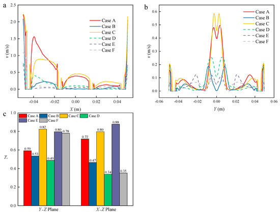 Distribution uniformity of velocity: (a) velocity distribution in X-Z Plane (Y = 0); (b) velocity distribution in Y-Z Plane (X = 0); (c) velocity uniformity index in the X-Z plane and Y-Z plane.