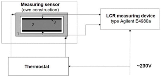 Diagram of the measurement system for testing electrical properties of engine oil. (1)—water jacket; (2)—sample; (3)—glass container with electrodes (measuring cell).
