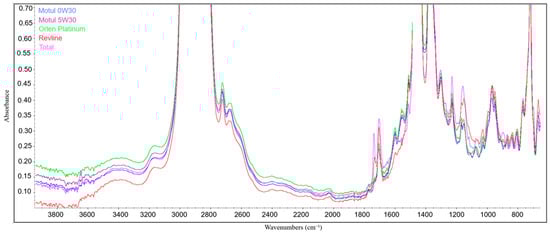 FTIR spectroscopy enabled the comparison of the chemical composition of the tested oils by analyzing their absorption bands. The obtained spectra revealed significant differences in key regions, indicating a varied content of additives and base oil components across the tested products (Figure 2 and Figure 3).