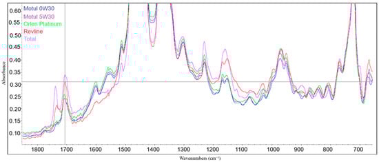 FTIR spectra of selected engine oils—functional region detail (650–1800 cm⁻1).