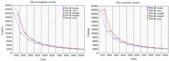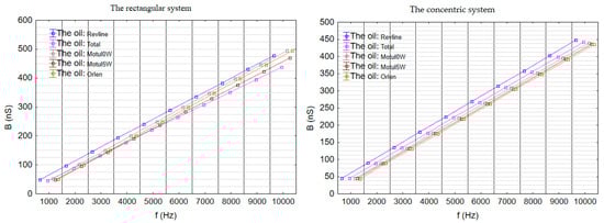 The analysis of susceptance (B) showed that for most oils—Motul 5W30, Motul 0W30, Platinum, and Revline—the values increased systematically with frequency and remained relatively close to each other (Figure 10). However, the behavior of Total oil differed depending on the measurement configuration. In the flat sensor system, Total exhibited clearly the lowest B values across the entire frequency range, and as frequency increased, its curve diverged further from the profiles of the other oils, indicating a distinct dielectric response. In contrast, in the concentric configuration, Total showed B values at low frequencies (e.g., 1000 Hz) that were comparable to those of the other oils—excluding Revline—but at higher frequencies (above 7000 Hz), its increase in susceptance became more similar to that of Revline. These differences suggest unique polarization characteristics of Total and emphasize that the choice of measurement setup influences the sensitivity to subtle differences between oil samples. Therefore, the B parameter may serve as a useful indicator in oil quality control, enabling the detection of variations in the content of polar additives in engine oils.