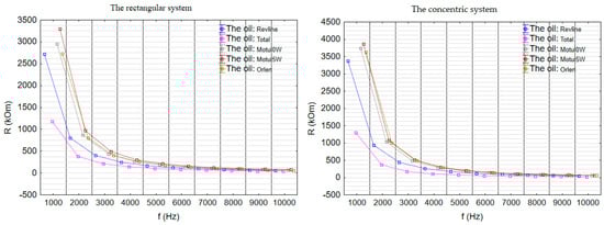 In both measurement setups, the highest resistance (R) values were observed for Motul 5W30 and Motul 0W30, indicating their superior dielectric properties (Figure 5). In all cases, Total exhibited significantly lower resistance, confirming its greater tendency for electrical conduction. Revline and Platinum showed intermediate values with Revline demonstrating slightly higher conductivity at elevated frequencies. A consistent ranking of oils in terms of resistance was maintained across both configurations, supporting the reliability of the results. Absolute resistance values were higher in the concentric system at lower frequencies, whereas the flat sensor provided better differentiation between samples at higher frequencies due to differences in sensor geometry.