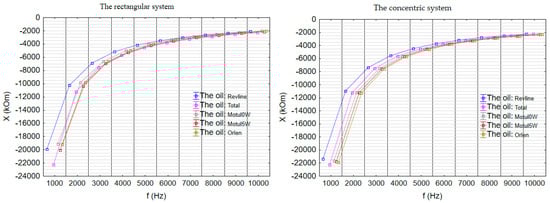 The reactance (X) values for the tested oils were negative across the entire frequency range, indicating their predominantly capacitive character (Figure 6). At lower frequencies, Motul 0W30 and Platinum exhibited higher absolute X values compared to Motul 5W30, with these differences becoming even more pronounced at higher frequencies. Total consistently demonstrated the lowest absolute reactance values in both configurations, suggesting a less pronounced of its capacitive nature. In the flat sensor setup, differences between Motul oils, Platinum, and Total were more evident, whereas in the concentric system, the results across samples were more uniform. This suggests that the concentric sensor configuration is less sensitive to subtle variations in the dielectric composition of the oils.