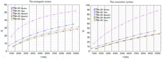 The quality factor (Q) values increased with rising frequency for all tested oils; however, the growth dynamics varied significantly (Figure 8). The lowest Q values were recorded for Motul 5W30 and Motul 0W30, followed by higher values for Platinum and Revline, while Total distinctly stood out with the highest Q values. In the flat sensor configuration, the Q values of Total were nearly twice as high as those of the other samples, whereas in the concentric configuration, it reached values almost three times higher. Notably, in the concentric setup, differences between Total and the other oils were relatively small at lower frequencies; however, from around 4000 Hz, the Q factor for Total increased markedly faster, showing a parabolic trend. This behavior indicates specific dielectric properties of Total, particularly under higher-frequency electric fields.