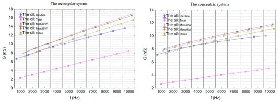 The analysis of conductance (G) revealed clear differences between the tested oils (Figure 9). In both measurement configurations (flat and concentric), Total consistently exhibited the lowest G values, confirming its superior dielectric properties in terms of electrical conductivity. The remaining oils—Platinum, Revline, and both Motul 5W30 and 0W30—showed higher conductance values, which were relatively similar to each other and increased with frequency. In the flat sensor configuration, the differences between the oils were more pronounced, whereas in the concentric system, the increase in G was more gradual. Motul 0W30 and 5W30 displayed slightly higher conductivity than Platinum and Revline, while Total maintained the lowest levels across all frequencies. This behavior indicates that conductance analysis can serve as an effective tool for the early identification of oils with better dielectric properties and for distinguishing products with higher concentrations of polar compounds.