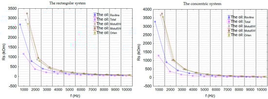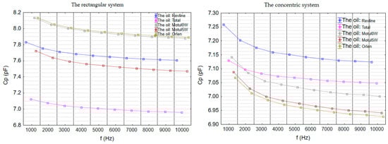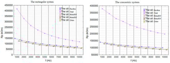 The analysis of the parallel equivalent resistance parameter (Rp) revealed that values in the flat sensor configuration were consistently higher than those in the concentric setup for all tested oils across the entire frequency range (Figure 13). This indicates lower energy losses recorded in the flat configuration. In both systems, a systematic decrease in Rp was observed with increasing frequency with more pronounced changes in the concentric setup.