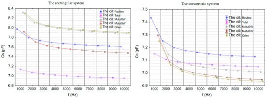 The analysis of Cp and Cs parameters revealed distinct differences between the measurement systems (Figure 11 and Figure 12). In the case of parallel equivalent capacitance (Cp), Total exhibited the lowest values in the flat electrode setup, clearly below the other oils, indicating a reduced ability to store electric charge. However, in the concentric setup, the lowest Cp values were recorded for Motul 5W and Platinum, while Total was closer to Motul 0W, suggesting that the concentric system reflects the dielectric structure of these oils differently.