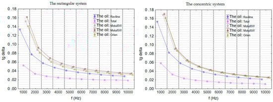Differences between the configurations were minor: tg δ values in the concentric setup were slightly lower than in the flat one, although the order of oils with respect to dielectric losses remained consistent. It is worth noting that the largest differences between the oils were observed at the lowest frequency (1000 Hz), whereas at higher frequencies (above 7000 Hz), tg δ values stabilized and converged, with Total consistently maintaining the lowest level of losses.