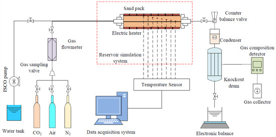- Reservoir Simulation System: The system is primarily used to simulate the underground environment of the reservoir, ensuring the accuracy of the experiment. It consists of a back pressure valve, a sand pipe, and a wall heater. (1) Back Pressure Valve: It can be used to simulate high-pressure environments, with a pressure range of 0.0–15.0 MPa. (2) Combustion Tube Model: The combustion tube has a length of 150 cm, an inner diameter of 6.4 cm, and a wall thickness of 3 mm. Its operating temperature range is –20 to 650 °C. (3) Wall Heater: It can rapidly heat the wall of the combustion tube model, achieve real-time temperature tracking, and ensure that the difference between the wall surface temperature of the model tube and the core temperature is less than 5 °C. This fully simulates the insulating ability of the formation. The heater has a power rating of 600 W, a width of 6.5 cm, and a total length of 24 cm.
