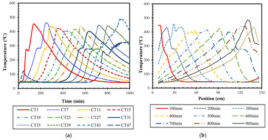 Figure 2 displays the temperature change curve of thermal miscible flooding in the high water cut stage. Figure 2a clearly shows that there is a stable heat propagation process during the experiment, which can form a stable thermal oxidation front. The advance speed of this thermal oxidation front is 19.5 mm/min. This phenomenon indicates that stable thermal miscible displacement can still be achieved in the high water cut stage. Figure 2b shows that thermal miscible flooding has a distinct constant-temperature interval at about 240 °C. During the process of thermal miscible flooding, high temperatures can cause water to change phase into water vapor. This constant-temperature interval is caused by the accelerated temperature transfer of water vapor.