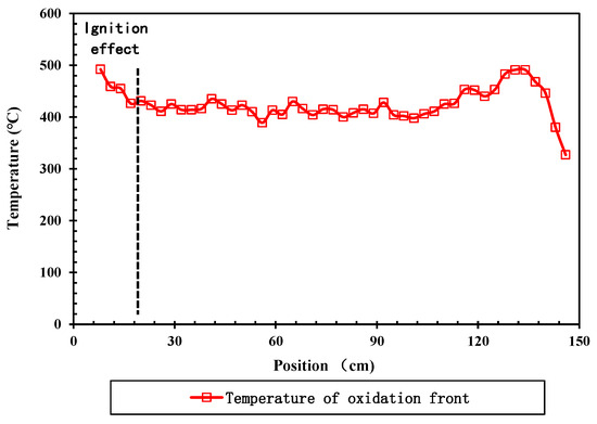 Figure 3 displays the highest temperature curve of measuring points in the thermal miscible flooding experiment. From Figure 3, it is observed that due to the ignition effect, the temperatures at measuring points 1 to 4 (represented by dotted lines in Figure 3) contain an error, which is higher than the actual temperatures. However, this error does not compromise the accuracy and reliability of the experiment. As shown in Figure 3, the peak temperature of the hot oxidation front during the air hot miscible drive’s steady advance is consistently stable at 390–430 °C. This indicates that the hot miscible drive can rapidly transition into a medium- to high-temperature oxidation state and maintain a stable, sufficient thermal oxidation reaction, allowing for a stable advance. At the later stage of the experiment, an area between the production port and the sand-filled pipe remained undisturbed, preventing effective displacement of the crude oil. This increased the supply of hot oxidation fuel, causing the temperature to gradually rise to 460 °C. Once the fuel was exhausted, the temperature dropped rapidly.