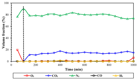 - Data Acquisition System: The system is primarily used for the collection and storage of data and consists of a temperature sensor, a pressure sensor, a gas component analyzer, and a data acquisition and processing system. (1) Temperature Sensor: This experiment uses a K-type thermocouple, which is installed along with heating tiles on the outer wall of the sand-filled pipe. Its accuracy is ±1 °C, and the measurement range is −20 to 1300 °C, with a total of 47 sensors. (2) Gas Component Analyzer: It performs online detection of CO, CO2, N2, H2, and O2 gas volume percentage content, with an accuracy of ±0.5% FS. (3) Data Acquisition Processor: With a minimum data acquisition interval of 1 s, it can achieve accurate measurement of data.