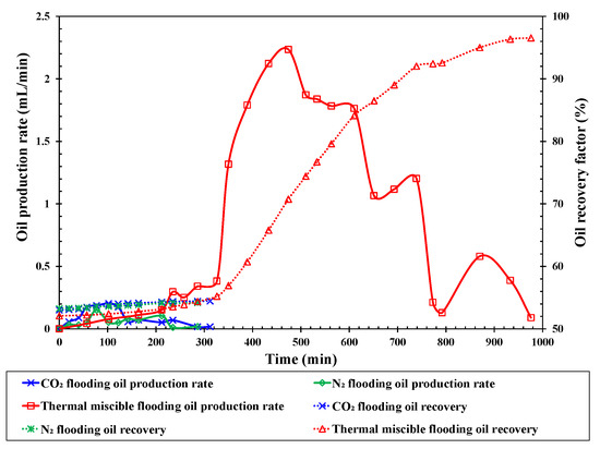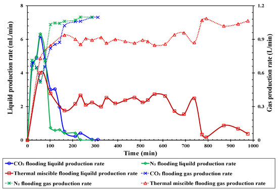 The liquid and gas production curves of different gas flooding methods.