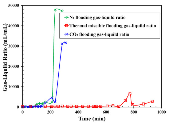 The gas–liquid ratio curves of different gas flooding methods.