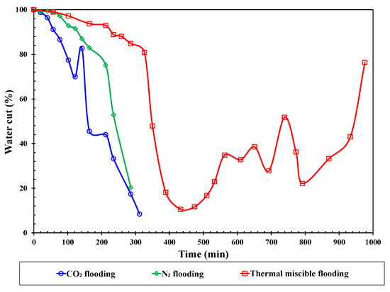 Figure 8 shows the curve of water cut changing over time. From Figure 8, in conjunction with Figure 5 and Figure 6, it can be observed that the initial stages of N2 flooding, CO2 flooding, and thermal miscible flooding are all characterized by a distinct water drainage period. In the absence of miscible displacement, because the mobility ratio of water to gas is lower than that of oil to gas, gas tends to preferentially breakthrough along water channels, leading to gas fingering. Consequently, during the later stages of the nitrogen and carbon dioxide flooding experiments, there is a rapid decline in both water cut and liquid production, indicating a severe gas fingering phenomenon. After the drainage period, the water cut in thermal miscible flooding decreases rapidly and then stabilizes, eventually rising quickly as the experiment concludes. The extended periods of stable production and drainage in thermal miscible flooding are attributed to the significant reduction in flue gas miscibility pressure due to the heat effect, which facilitates miscible displacement during the process. The high oil displacement efficiency of miscible displacement creates a high oil saturation “oil wall,” which can resaturate the crude oil in water-favored channels, significantly reducing the gas relative permeability and suppressing gas flow. This phenomenon indicates that thermal miscible flooding possesses the ability for self-profile control.