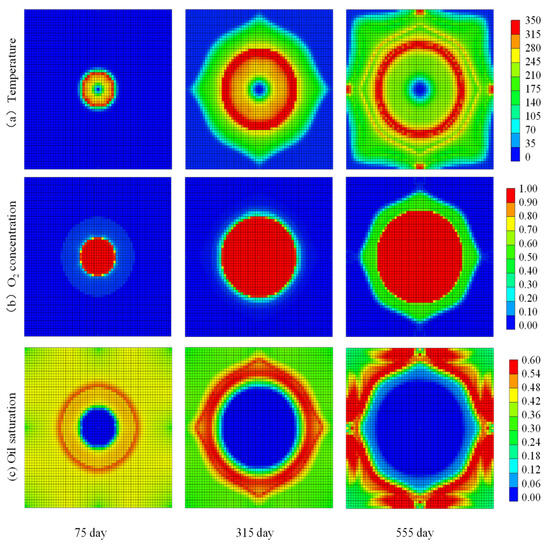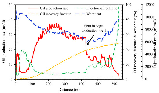 Figure 10 shows the temperature, oil saturation, and gas phase oxygen concentration fields during the air thermal miscible flooding at different periods in Layer 4. From Figure 10a, it can be seen that during the production in the high water cut stage, the air thermal miscible flooding can form a stable thermal oxidation front at 200~350 °C and steadily advance towards the production well, achieving stable progression within a single layer. At the same time, it can be observed from the figure that due to the effect of gravity differentiation, an overshoot of air occurs, resulting in a stratified thermal oxidation front in the temperature field. From Figure 10b, it can be observed that the oxygen in the injected gas is rapidly consumed at the position of the thermal oxidation front, with virtually no oxygen passing through it. Production wells can operate for an extended period with an oxygen concentration in the produced gas of less than 5%, ensuring the safety of field operations.