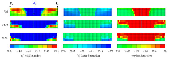 Figure 11 demonstrates the vertical distributions of oil, gas, and water during thermal miscible flooding at different stages. The results reveal significant gas overriding behavior, with gas chambers exhibiting an inverted triangular distribution. In the vertical profile, thermal miscible flooding forms a continuous oil bank that migrates toward the production well as gas injection increases. Most gas remains confined within the oil bank, while bound water is displaced and produced by gas under thermal effects. This indicates that thermal miscible flooding effectively suppresses chaotic gas migration through oil bank formation, thereby enhancing displacement efficiency.