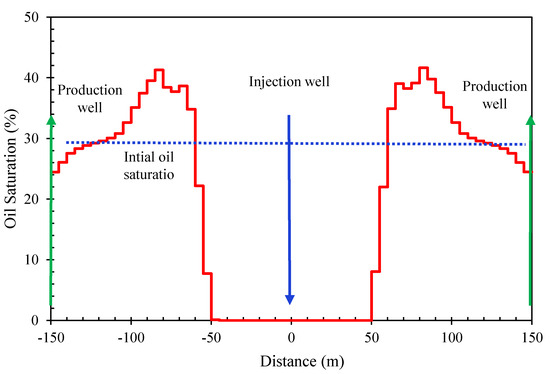 Figure 12 displays the oil saturation profile curve of production wells P4 to P5 in Layer 4 at 315 days. In conjunction with Figure 10c, it can be seen that within the area affected by the high-temperature thermal oxidation front during the thermal miscible flooding process, the residual oil saturation is essentially zero. With this high efficiency of oil displacement, a stable oil-rich zone, commonly referred to as an ‘oil bank’, can form at the position of the thermal oxidation front. The width of this oil bank continues to increase as the thermal oxidation front advances.