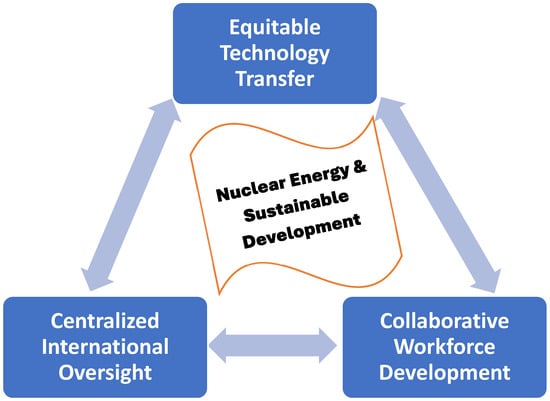The Q-NPT framework is conceived as a normative vision grounded in the principles of equity, sustainability, and global collaboration. It integrates elements of conceptual modeling to guide governance practices and draws on theoretical insights to address systemic inequities in nuclear energy governance. The Q-NPT framework represents a strategic reimagining of nuclear governance that prioritizes transparency, inclusivity, and cooperation to address global energy and development challenges. In an era marked by the urgent need for energy transitions, the framework provides a pathway to foster trust between nuclear and non-nuclear states, ensuring equitable access to the benefits of nuclear energy. Figure 1 provides an overview of the framework, which emphasizes collaboration and mutual accountability as cornerstones for integrating nuclear technologies into the energy systems of developing nations. By doing so, it seeks to drive energy security, economic growth, and alignment with sustainable development goals [10,11]. Kühn [12] underscores that the realization of these objectives requires overcoming entrenched geopolitical, technical, and institutional barriers through trust-building measures, such as multilateral agreements and confidence-building mechanisms.