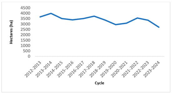42]. To assess the potential of these lands, an analysis was conducted of the cultivated area and the types of crops present in the area adjacent to the hotel complex. It was found that, between 2012 and 2024, the average agricultural area with planting permits was 3397 hectares (ha), with a downward trend in recent years (