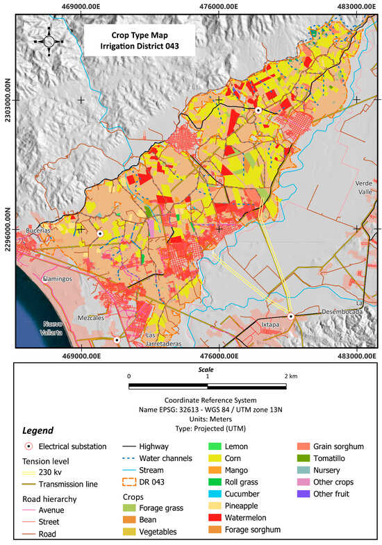 Figure 7 shows a map with the distribution of crop types in the 2023–2024 season, the water supply network, roads, and the electricity distribution network in Distrito de Riego 043, adjacent to the tourist destination and which has the farmland where solar farms can eventually be installed to supply electricity to luxury four- and five-star hotels and reduce almost 400 thousand tCO
