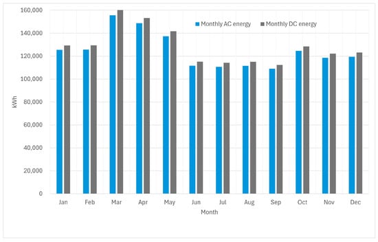 By performing a simulation in the System Advisor Model (SAM) program for Puerto Vallarta with coordinates 20.6084° north latitude and −105.235° longitude, the following information is obtained considering 1,470 600Wp single-facial MFVs, with 18 inverters of 50 kW each, in an-array of 21 MFVs in series with 70 arrays in parallel: an AC energy of 1,498,573 kWh and a DC energy of 1,544,810 kWh would be generated per year. The monthly generation is shown in