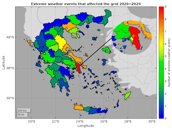 In recent years, the infrastructure of power systems has been increasingly impacted by extreme weather events such as storms, heatwaves, snowfall, and strong winds. For example, the Hellenic Electricity Distribution Network Operator (HEDNO) reported 3587 faults in 2021 in its Medium Voltage Network, with 18.5% directly attributed to adverse weather conditions [1]. The rising frequency and severity of such events—driven largely by climate change—highlight the vulnerability of legacy power grids [2,3], which were designed under assumptions of climatic stability.